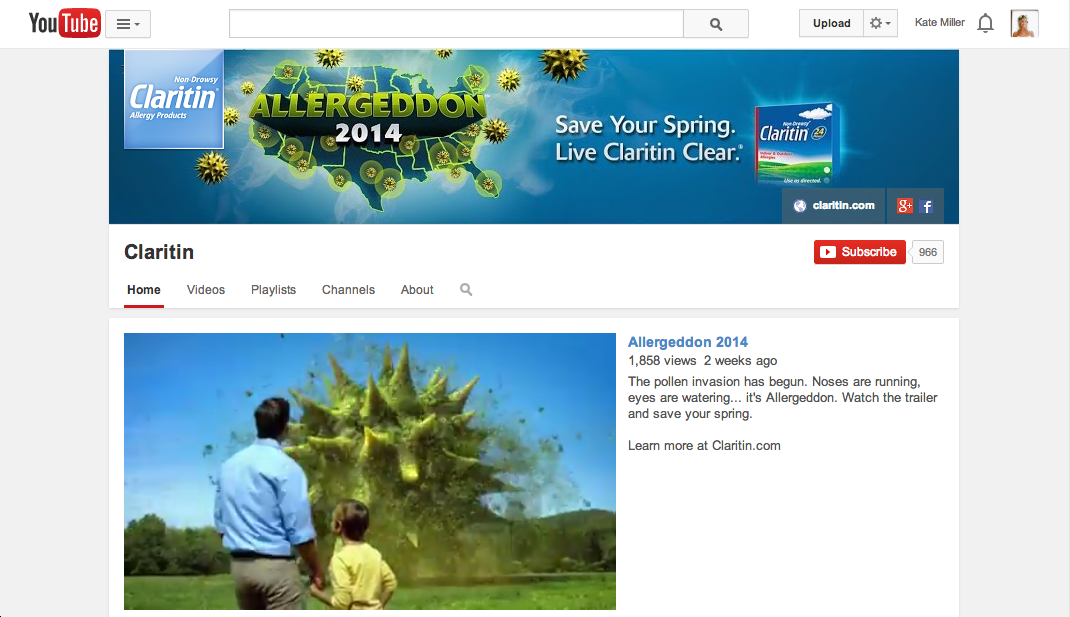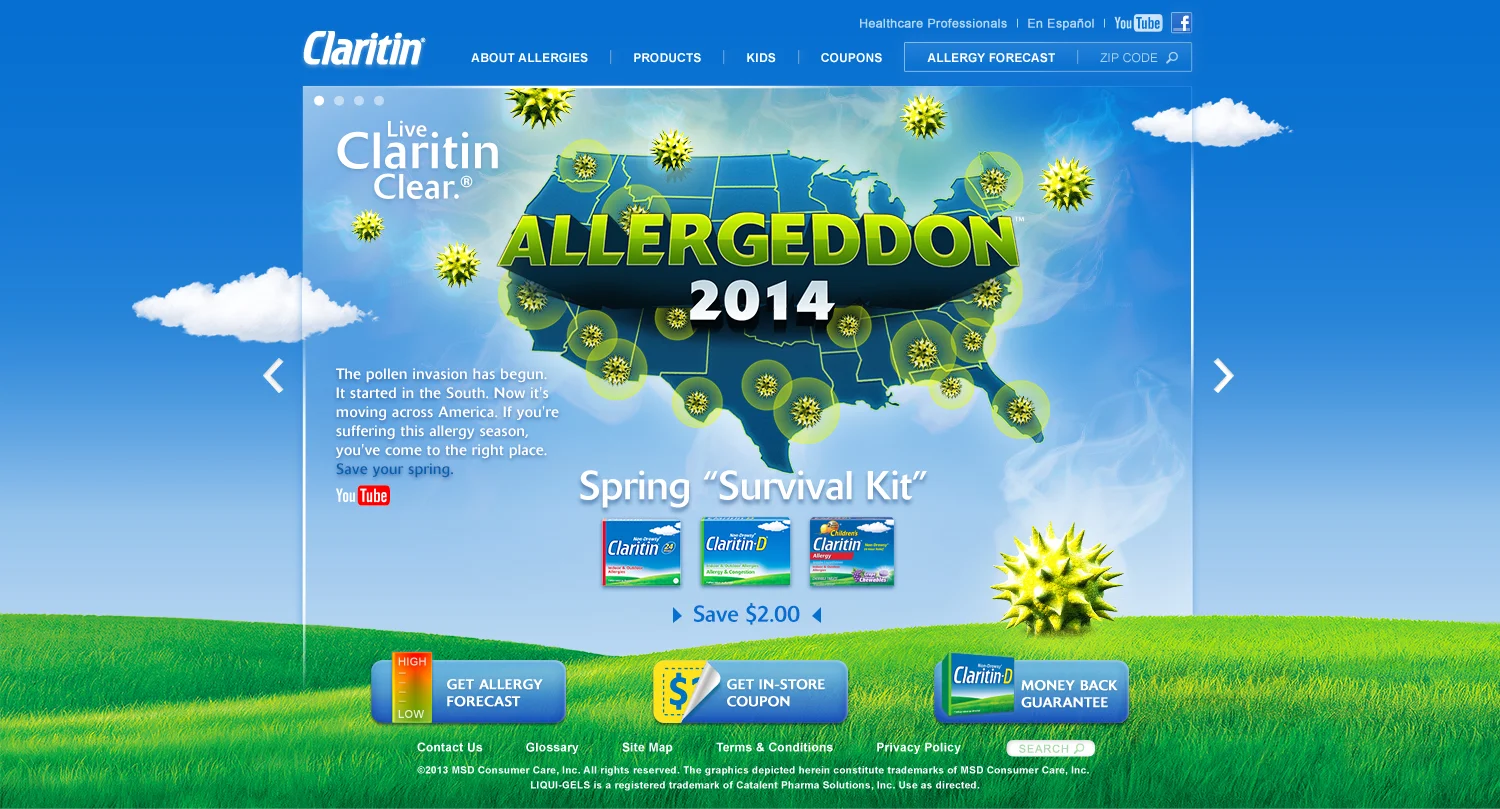 Spring 2014 was one of the worst allergy seasons ever. To drive sales of Claritin, we gave this phenomenon a name— 'Allergeddon'—and created a timely integrated campaign. Campaign materials included a pre-roll video, a 30-second radio spot, digital OOH, and a Claritin website takeover. We also re-skinned the Claritin YouTube channel and Facebook page.